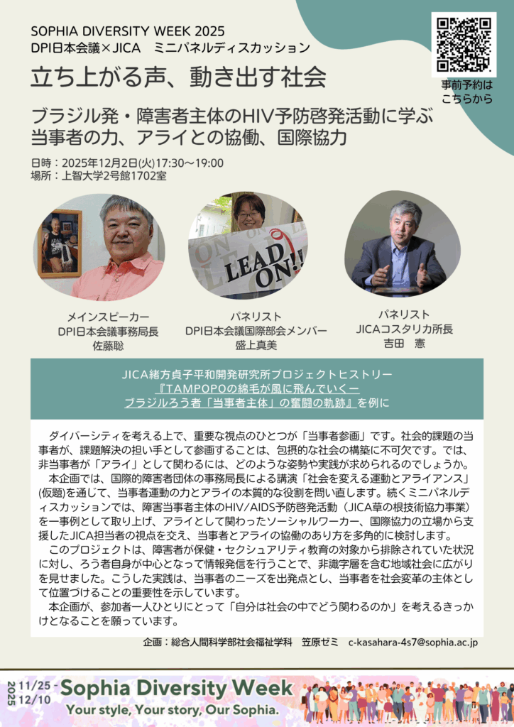 ダイバーシティウィーク企画の一つとして、12月2日(火)17:30より、ブラジルにおける障害当事者主体のHIV/AIDS予防啓発活動(JICA草の根技術協力事業)を一事例として取り上げ、当事者とアライの協働のあり方を多角的に検討するミニシンポジウムを、笠原ゼミで計画しています。